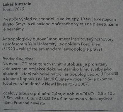 Citujeme informaci z Reflexu z 4.11.2010 z článku Mistři (Sedm z dvaceti držitelů Ceny Jindřicha Chalupeckého ....)Ve Vysokém Mýtě se Lukáš Rittstein (nositel Ceny Jindřicha Chalupeckého za rok 1999) seznámil s autobusovým nadšencem Stanislavem Ferklem. Ten mu pomohl autobus Volvo zakoupit a zároveň upravit tak, že se dá (i přes značné zásahy do konstrukce) přemisťovat po zemi, na vodě i ve vzduchu. Po pražské instalaci se vozidlo vydá na velkolepou cestu kolem světa. Za zmínku určitě stojí, že na střechu pražského DOX bylo nainstalováno pomocí velkého jeřábu. O vlastní soše TOUR... výtvarník říká: "Jde o antropologický putovní monument, inspirovaný rozhovory s profesorem Yaleovy univerzity a zakladatelem moderní antropologie práva Leopoldem Pospíšilem, narozeným v roce 1923. Přestože výhled ze sedadel je velkolepý, řízení je cestujícím skryto. Dá se říci, že smysl našeho dočasného výletu na planetu zemi je neznámý."