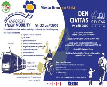 Město Brno se v rámci Projektu Brno-Zdravé město každoročně zapojuje do kampaně Evropské unie na podporu ekologicky šetrnějších způsobů dopravy Evropský týden mobility. V letošním roce budou mít Brňané opět možnost zúčastnit se v rámci Evropského týdne mobility ve dnech 16. - 22. září mnoha zajímavých akcí. Na křižovatce ulic Joštova a Česká bude po celou dobu kampaně umístěn informační stánek, kde získají Brňané informace o plánovaných i realizovaných projektech v oblasti udržitelné dopravy v městě Brně. Na stánku bude každý den, kromě neděle, probíhat od 15:00 do 17:00 hodin představení nových projektů města Brna v oblasti dopravy, v této době se budou moci obyvatelé obracet se svými dotazy na zástupce různých odborů Magistrátu města Brna. Na infostánku se např. představí projekt CIVITAS ELAN, podporující městskou hromadnou dopravu a společnost KORDIS JMK se zajímavými podrobnostmi o Integrovaném dopravním systému JMK.