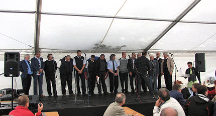 Vodiči autobusov - tentokrát pretekári. Slávnostný nástup pred pretekmi, kde si všetci pripili, ako sa na správnych vodičov patrí, pohárom čistej vody.