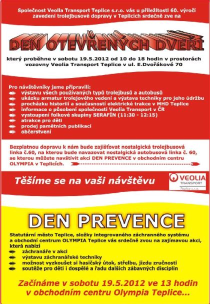 Den otevřených dveří proběhne v sobotu 19.5.2012 od 10 do 18 hodin v prostorách vozovny Veolia Transport Teplice v ul. E. Dvořákové 70. Pro návštěvníky bude připravena bezplatná přeprava, kterou bude zajišťovat nostalgická trolejbusová linka č.60, na kterou bude navazovat nostalgická autobusová linka č.60. S totou linkou můžete navštívit akci Dwn prevence v obchodním centru OLYMPIA v Teplicích.