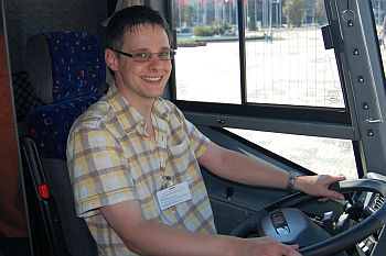 Novináři si mohli autobus sami vyzkoušet na uzavřené trati v areálu brněnského výstaviště.