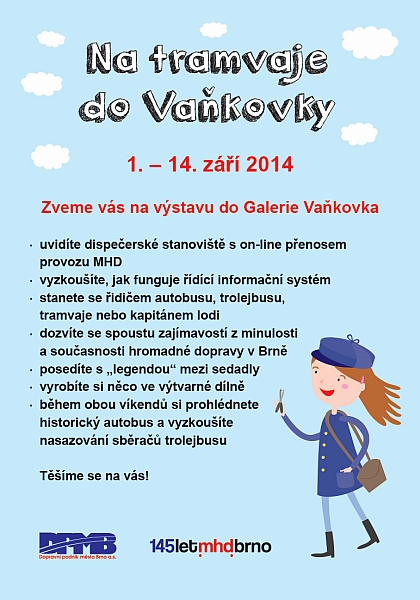 Oslavy 145. výročí městské hromadné dopravy v Brně, které probíhají celý tento rok, pokračují zajímavou výstavou, jež bude od začátku školního roku instalována v nákupní galerii Vaňkovka. Na své si přijdou zejména malí i velcí fandové dopravy, kteří si budou moci kromě stručně a vtipně zpracovaných informací o městské hromadné dopravě prohlédnout zde instalované dispečerské stanoviště s funkčním řídícím informačním systémem a simulátorem palubní informatiky používané ve vozidlech MHD. Chybět nebudou oblíbené dětské trenažery autobusu, trolejbusu, tramvaje a lodi, stánek informační kanceláře s prodejem upomínkových předmětů a výtvarná dílna.