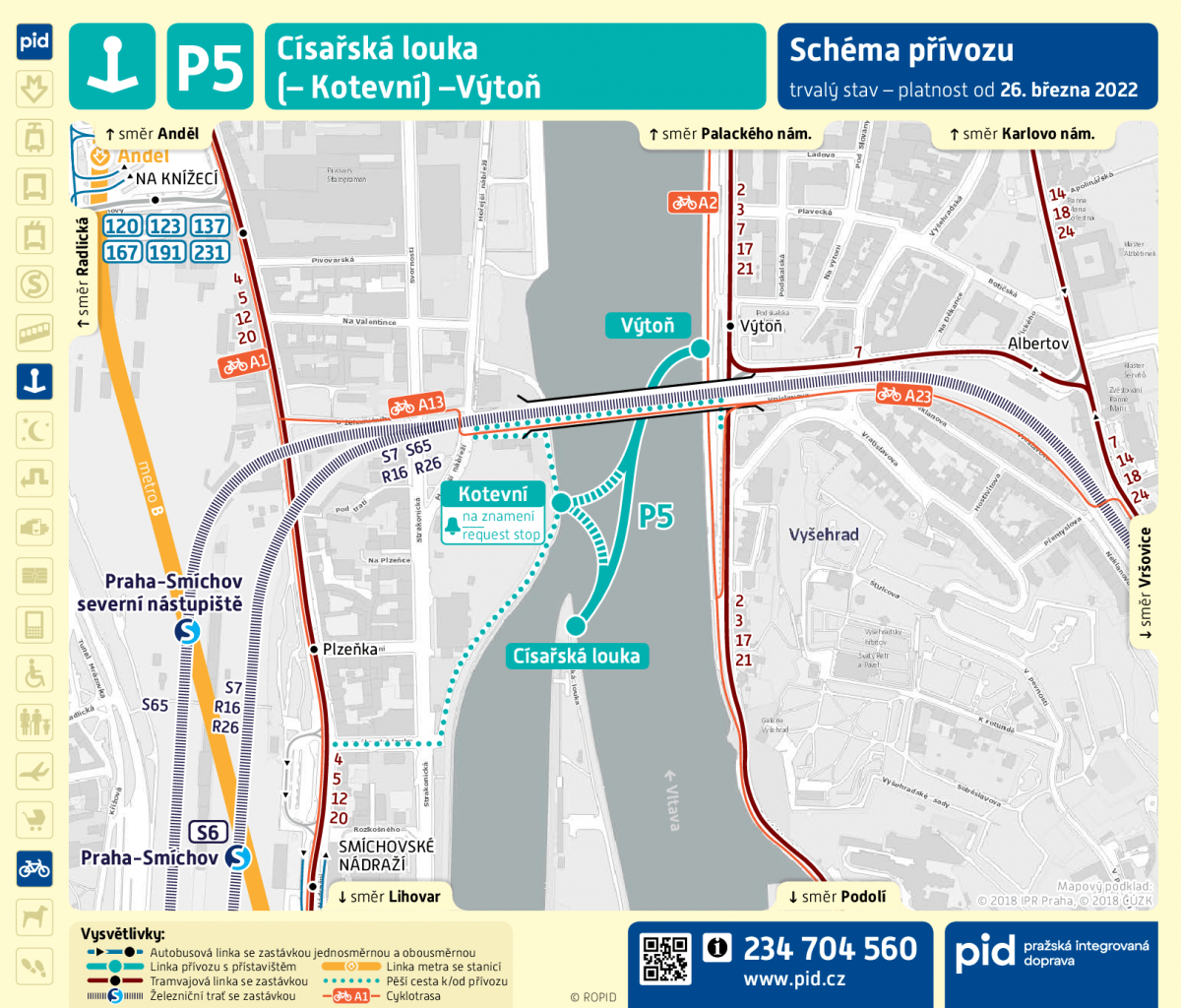 Výtoňský přívoz P5 nově popluje celodenně v kratším intervalu 20 minut a bude zajišťovat i obsluhu přístaviště Kotevní (do minulého roku obsluhováno samostatnou linkou P4, nově ale v režimu „na znamení“). Tím dojde k potřebnému posílení kapacity mezi ostrovem Císařská louka a Výtoní, současně však zůstává i výrazně méně poptávané spojení na levý břeh Vltavy.