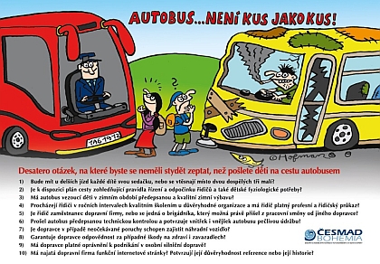 Přestože všechny statistiky říkají, že nejbezpečnější cesta po silnici je autobusem, lze i málo pravděpodobná rizika spojená s tímto druhem dopravy ještě snížit. Sdružení automobilových dopravců ČESMAD BOHEMIA sleduje velmi pečlivě situaci v hromadné dopravě osob na silnici. Za posledních dvacet let se vozový park autobusů změnil ještě radikálněji než u osobních automobilů. Výrobci téměř revolučně zvýšili bezpečnostní standardy autobusů všech kategorií. Stejně tak technologický pokrok a konkurence dramaticky pozdvihl kulturu cestování. Dospělí cestující si to přesně uvědomují a umí si zjednat služby na té nejvyšší úrovni. To bohužel neplatí pro nejmenší a nejzranitelnější pasažéry, kterými mohou být i vaše děti.