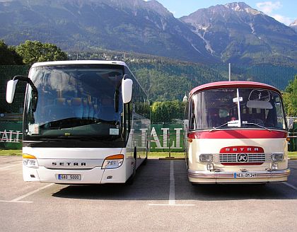 Setra a Setra. Setkání nejnovější Interbusové se zahraniční klasikou. Foto Interbus Praha.