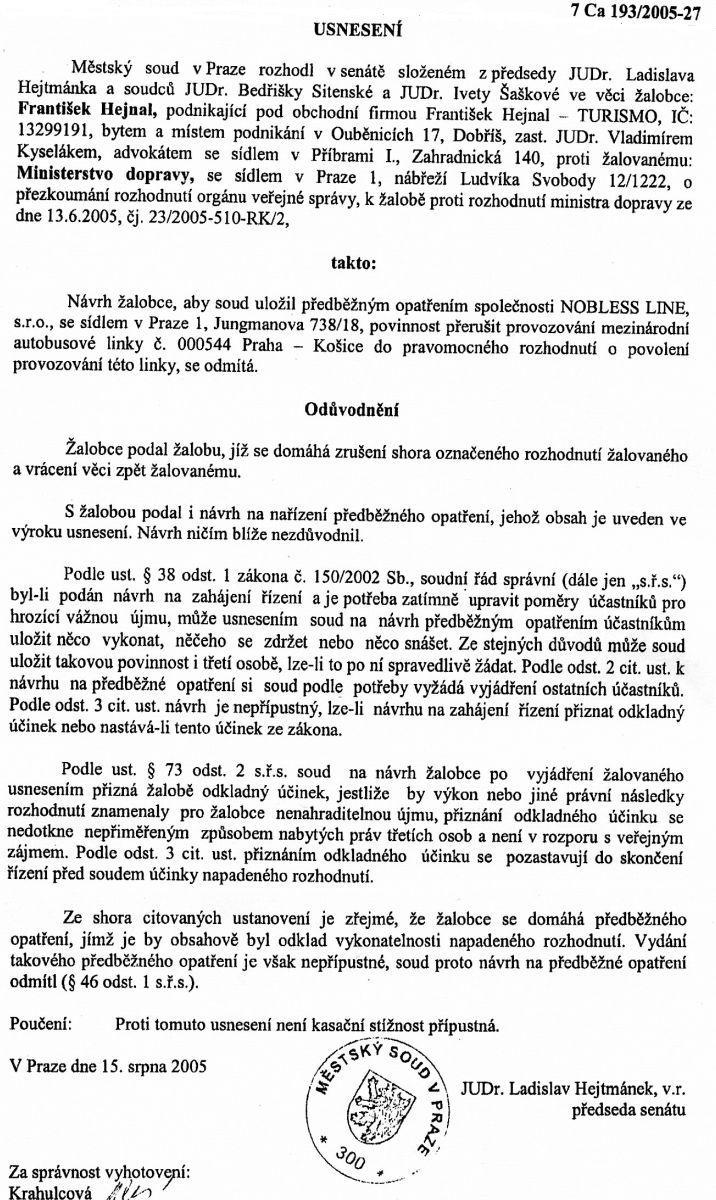 Vzhledem k tomu, že BUSportál sleduje dění kolem linky Praha-Košice zejména ve vztahu k nové lince společnosti Nobless Line, využili jsme nabídku této společnosti k uveřejnění USNESENÍ 7Ca 193/2005-27.