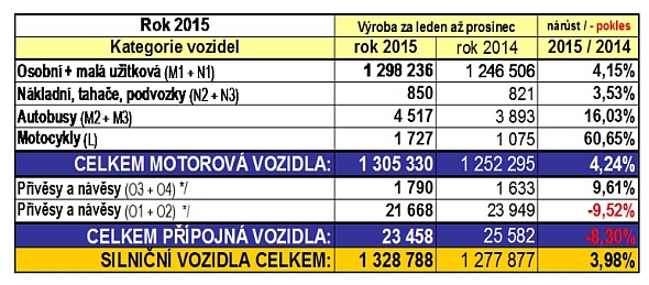 V České republice bylo v roce 2015 vyrobeno celkem 1 328 788 ks silničních vozidel, z toho 1 305 330 motorových a 23 458 přípojných. Jedná se o nejvyšší roční produkci vozidel v dosavadní historii České republiky či Československa.