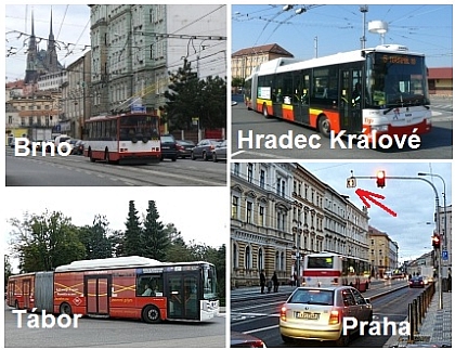 Vyhrazený pruh Brno, kloubový trolejbus Hradec Králové, kloubový CNG bus Tábor a světelná závora Praha (šipka).