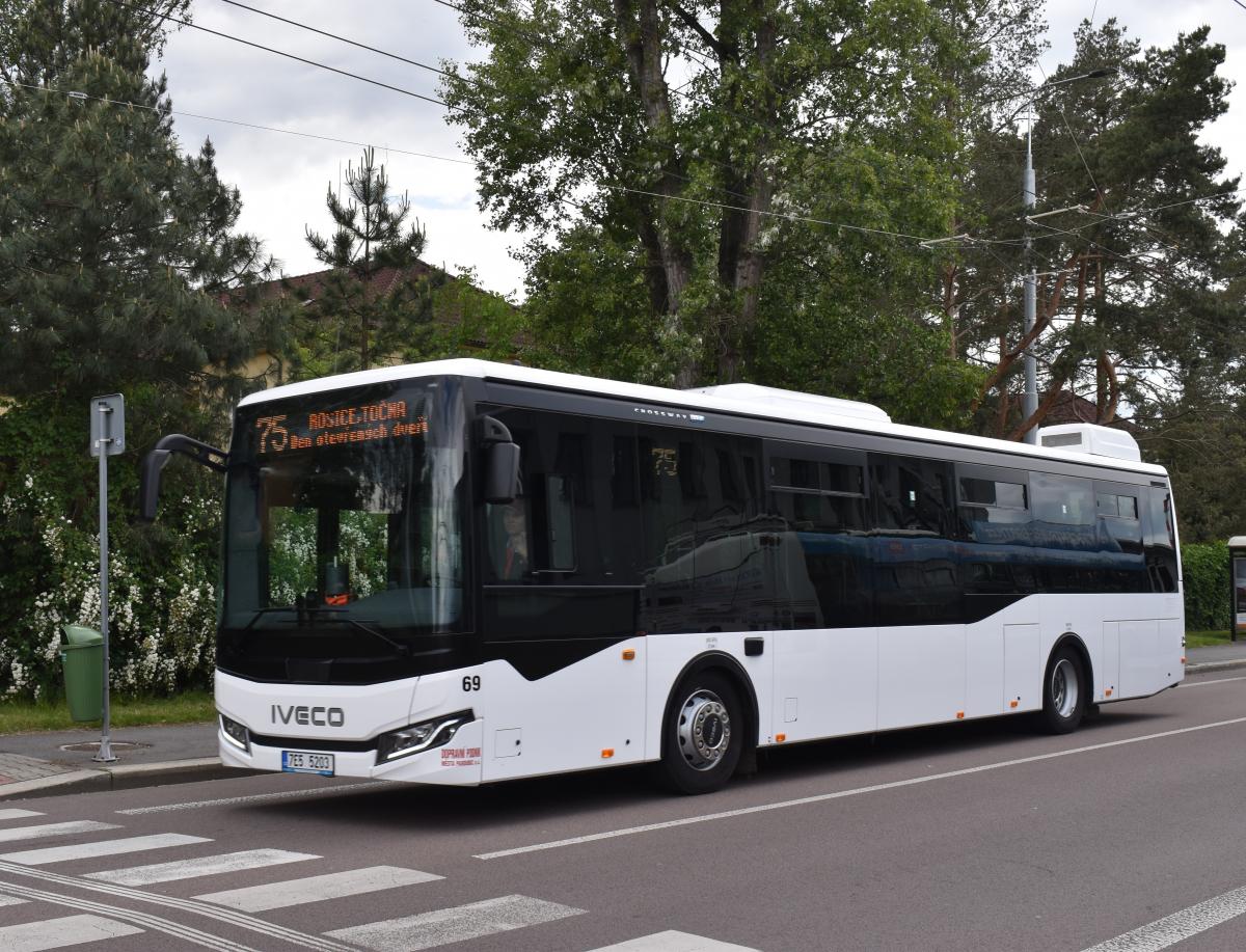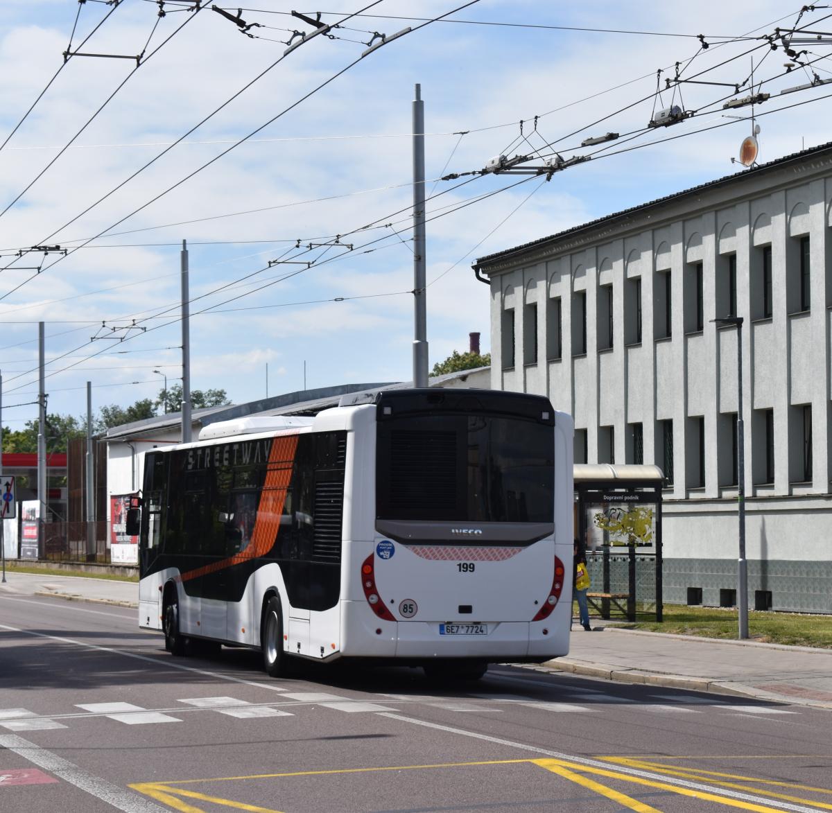 K zastávce Dopravní podnik přijíždí Iveco Crossway LE 12M City v hybridním provedení