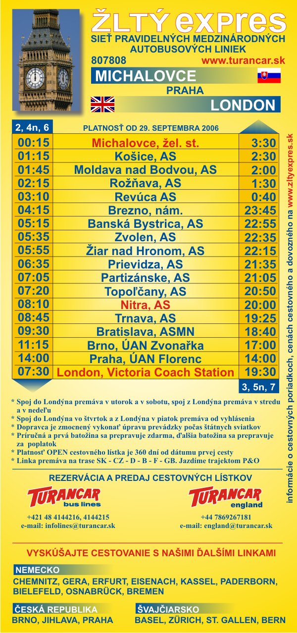 Znamená to, že od 16.09.2006 môžu touto linkou do a z Londýna cestovať aj cestujúci z Českej republiky. Z Brna /nást. č. 22/ o 11:15 hod., z Prahy /nást. č. 9/ o 14:00 hod. v smere do Londýna. Odchod z Lobdýna je o 19:30 hod. miestneho času z Victoria Coach Station, s príchodom do Prahy o 14:00 a do Brna o 17:00
