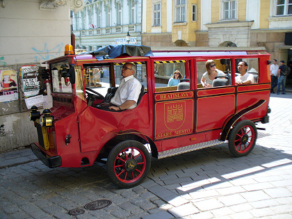 Vyhliadkový retro midibus s vlekom v uliciach bratislavského Starého mesta.