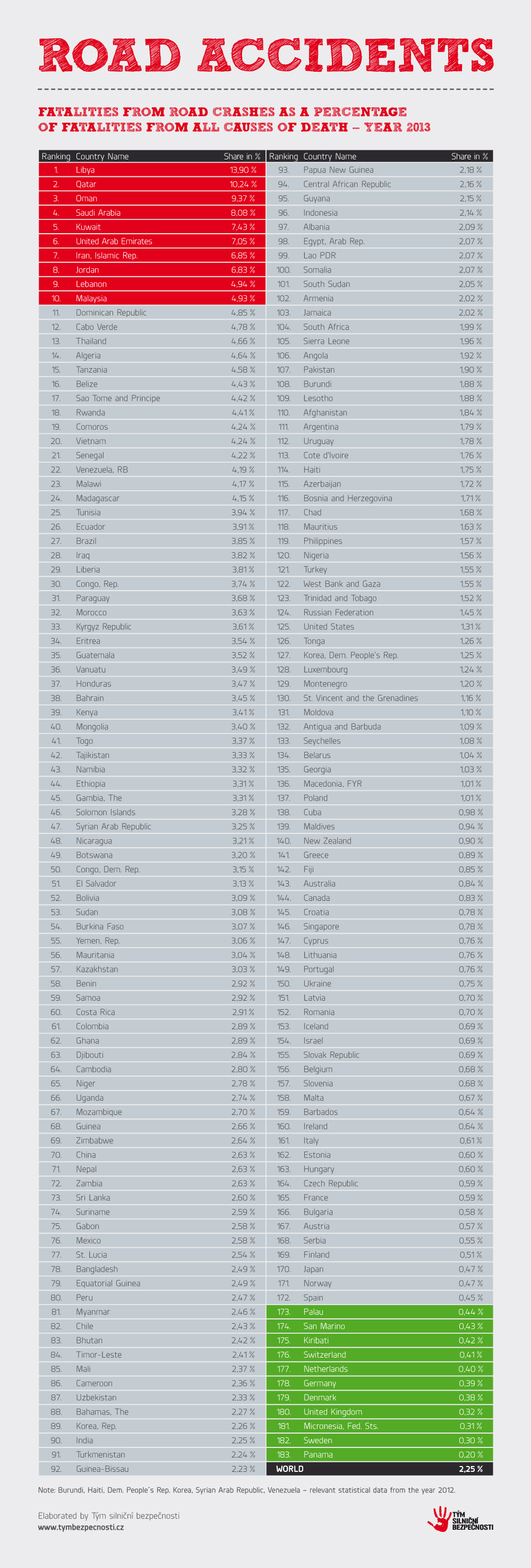 Příslušnou analýzu provedl Tým silniční bezpečnosti. Na celém světě žilo v daném roce průměrně 7 162 119 434 lidí. Na jeden tisíc z nich zemřelo 7,79 osoby. Z toho při dopravních nehodách cca 0,175 osoby, tedy 2,25 procenta všech zemřelých. Každý 44. obyvatel Země tak zemřel zbytečně v důsledku silniční dopravní nehody. Situace v jednotlivých státech však byla odlišná. Nejvyšší podíl obětí nehod byl zaznamenán v Libyi (13,9 procenta, tedy každý sedmý zemřelý), dále pak v Kataru (10,24 procenta) a Ománu (9,37 procenta). Od podobného průzkumu, který za rok 2008 provedla americká University of Michigan, se pozice na první příčce žebříčku změnila. V daném roce patřila Spojeným arabským emirátům, kde při nehodě umíral každý šestý zemřelý. „V roce 2013 sestoupil daný stát na šestou příčku, přičemž situace se citelně zlepšila. Emiráty výrazně zlepšily kvalitu své silniční sítě, na níž jezdí moderní bezpečná vozidla, navíc velká pozornost začala být věnována i přípravě a zkouškám nových řidičů,“ vysvětluje Roman Budský z Týmu silniční bezpečnosti. Za povšimnutí stojí i to, že USA a Rusko se v žebříčku za rok 2013 nacházejí vedle sebe. Podrobnější analýza však odhalí, že zatímco v roce 2013 zemřelo v Rusku při nehodách 189 osob na milion obyvatel, v USA jich bylo 106. „Navíc pokud se jedná o oběti na miliardu ujetých kilometrů, patřily USA v roce 2014 s hodnotou 6,7 k nejbezpečnějším na světě (v ČR to bylo 12,1). Spojené státy zkrátka žijí na kolech,“ dodává Roman Budský.