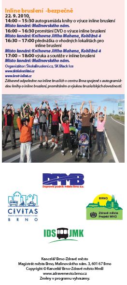 Pro zájemce připravila kancelář Brno – zdravé město bohatý program (viz přehled akcí na obrázcích), ze kterého upozorňujeme zejména na sobotu 18.9.2010, kdy proběhne od 13. do 17. hodiny na Malinovského náměstí Den CIVITAS podporující projekt CIVITAS ELAN zaměřený na zlepšování kvality brněnské MHD. V rámci Evropského dne trolejbusů bude představen projekt TROLLEY podporující rozvoj trolejbusové dopravy.
