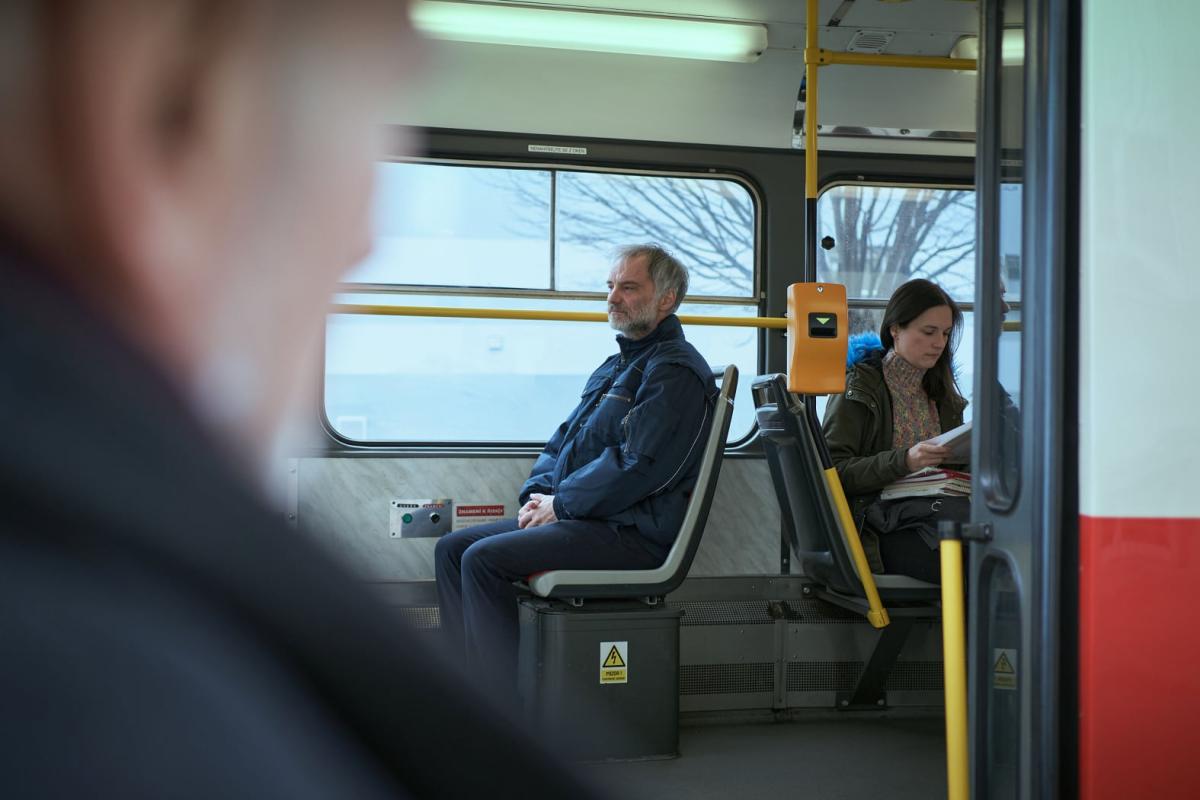 Hippokratova armáda, Ivan Trojan jako cestující v pražské tramvaji. Foto Igor Orozovič