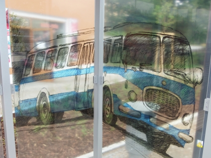 Zastávka, kterou můžete vidět na fotografiích, má výraznou souvislost s "místními" historickými vozidly, která na autobusové zastávce našla svoje místo. Nechybí tu připomínka výročí, které jsme na počátku roku slavili: