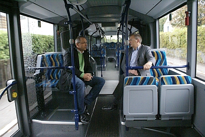 Kloubový autobus je navíc vybaven oproti standardnímu vyšším komfortem odpružení, takže po silnicích doslova pluje. Příjemné je tradičně tlačítko parkovací brzdy s automatickým odblokováním při rozjezdu např. při čekání na semaforech. V novém Citaru sedí řidič výše - kromě toho, že se tím dociluje psychologický efekt pohledu z očí do očí řidič - cestující, je vyšší poloha samozřejmě příjemnější pro rozhled i celkový pocit. Ergonomie kokpitu je jednoduchá, intuitivní a pohodlná. I když Andreas Türk pro redakci připravil ohleduplně trasu s delšími rovnými úseky, nechyběly ani nájezdy a sjezdy a kruhové objezdy, vše zvládnutelné. Kolegové novináři pak projeli vilovou čtvrtí Germeringu po trasách, kde běžně jezdí standardní dvanáctimetrové autobusy MVV. Koordinátora MVV představíme také v samostatném materiálu.