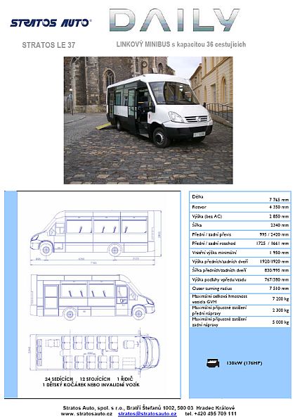 Doplněno: Za technický list a upřesnění názvu midibusu děkujeme společnosti STRATOS AUTO. Daily Stratos L 37 - jak jsme nepřesně uvedli - je midibus se zavazadlovou zadní částí, LE 37 je midibus s nízkopodlažní zadní částí. V současnosti společnost připravuje midibus Eco Daily Stratos s motorem splňujícím emisní normu EEV.