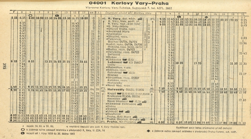 Jízdní řád 04001 Karlovy Vary-Praha 1959-60. Autobus ovšem odjížděl z Florence už ve 13:00, v Karlových Varech byl v 16:15. Dnes jste v Karlových Varech autobusem o celou hodinu dříve.