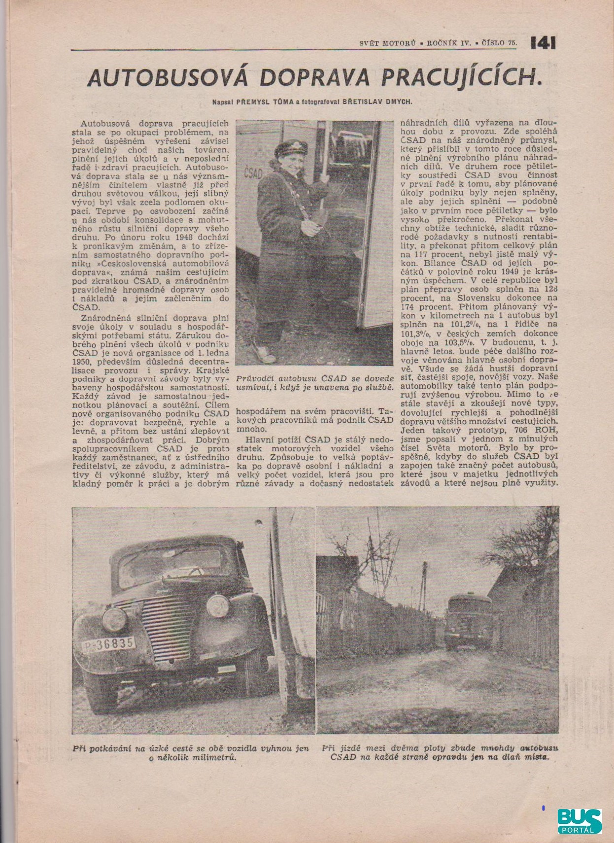 Autobusová doprava u nás získávala význam ještě před druhou světovou válkou, mohutný růst silniční dopravy ale začal až po osvobození. Na autobusové dopravě pracujících závisel chod továren a mnohdy i životy lidí. Po únoru 1948 byl zřízen dopravní podnik Československá automobilová doprava - ČSAD, do kterého byly začleněny znárodněné firmy, které pravidelnou hromadnou dopravu dříve zajišťovaly.